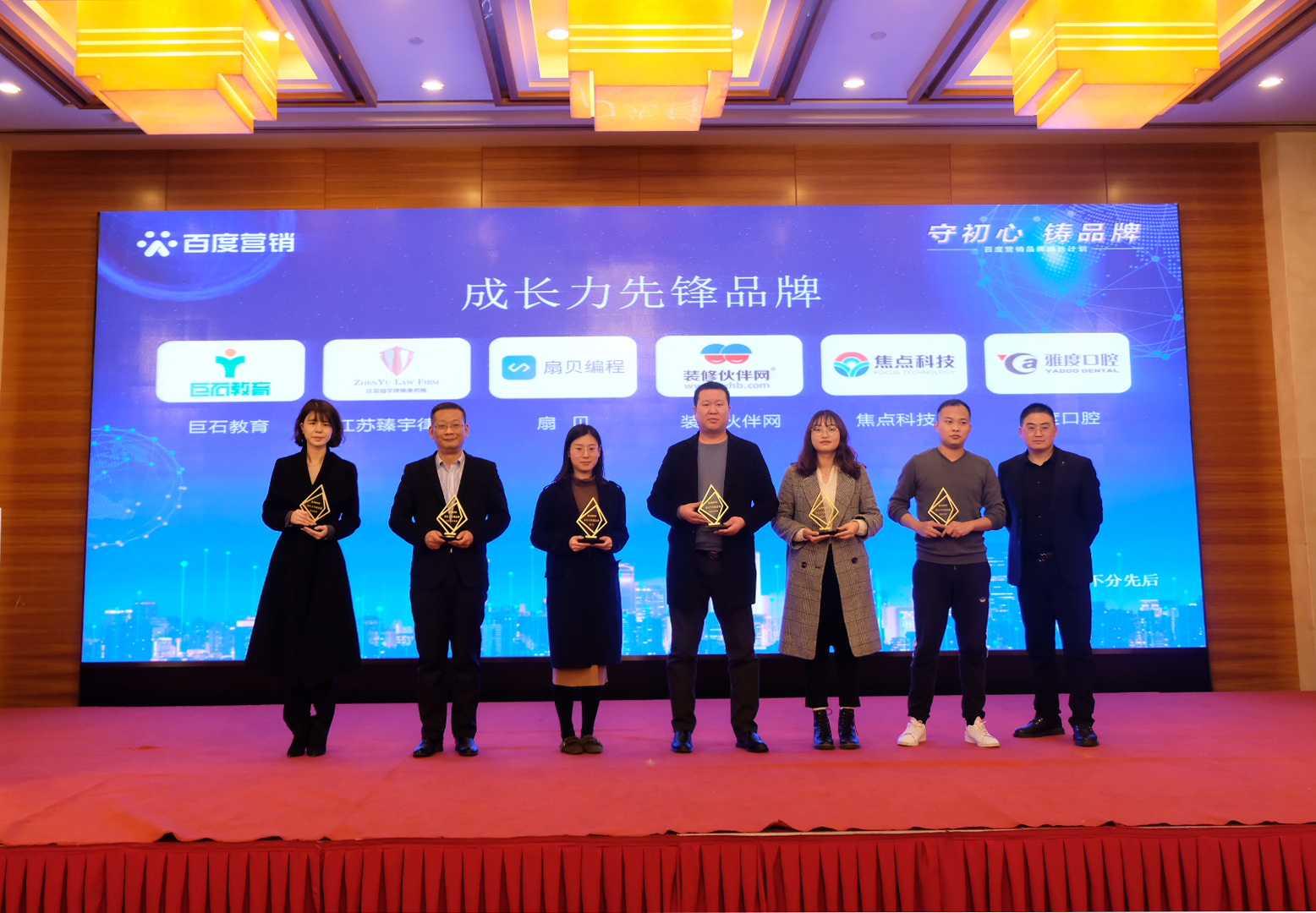 南京是一座歷史文化名城,同時(shí)也是一座創(chuàng)新名城,在創(chuàng)新的路上匯聚了眾多品牌力量。在發(fā)布會(huì)上,根據(jù)數(shù)據(jù)趨勢(shì)、百度搜索熱度排名等數(shù)據(jù),首屏百度營銷(南京)服務(wù)中心分別為巨石教育、焦點(diǎn)科技、扇貝、裝修伙伴網(wǎng)、江蘇臻宇律所、雅度口腔6家企業(yè),頒發(fā)“成長力先鋒品牌”榮譽(yù)獎(jiǎng)項(xiàng),以鼓勵(lì)品牌企業(yè)長遠(yuǎn)發(fā)展。