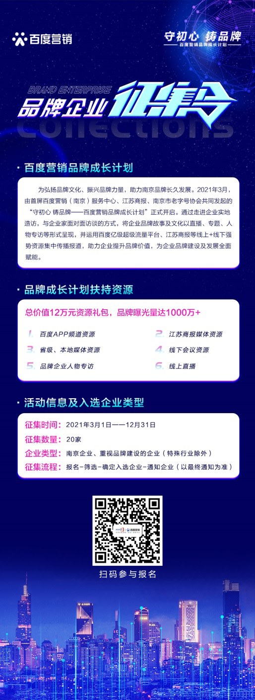 作為百度營銷大型品牌IP,“百度營銷品牌成長計(jì)劃”深度聚焦南京品牌企業(yè)、挖掘品牌故事,借助百度億級(jí)超級(jí)流量平臺(tái)資源、百度 AI技術(shù)、大數(shù)據(jù)能力以及全鏈?zhǔn)綘I銷能力,以直播、視頻、專題、人物專訪等形式,為南京品牌企業(yè)提供多維度品牌價(jià)值提升與增值。